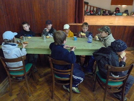 | A u těchto bytelnejch stolů jsme se krmili, tady zrovna snídají Jestřábi. |